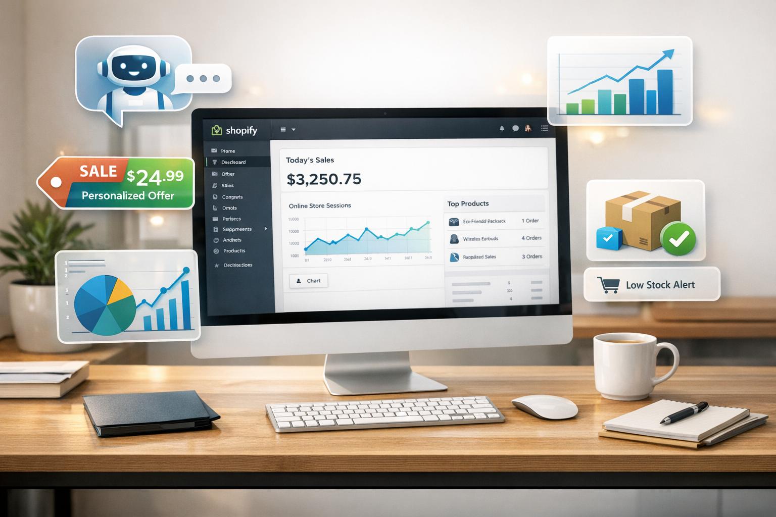Overview of AI tools for Shopify: virtual try-ons, personalized recommendations, inventory forecasting, chatbots, dynamic pricing, and ROI measurement.